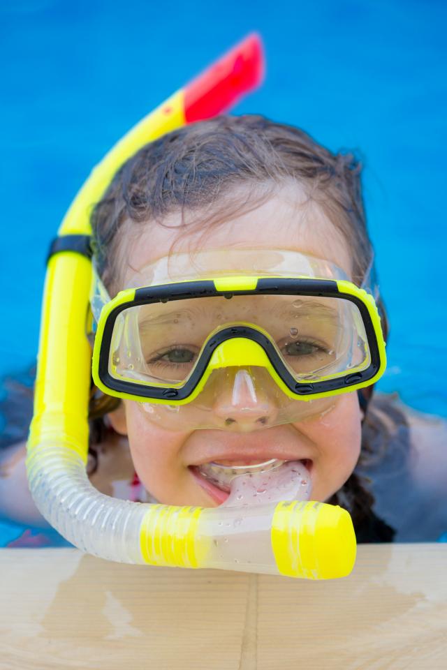 Wallpaper A little girl in a mask with a tube is swimming in the pool