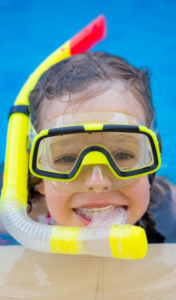 Wallpaper A little girl in a mask with a tube is swimming in the pool