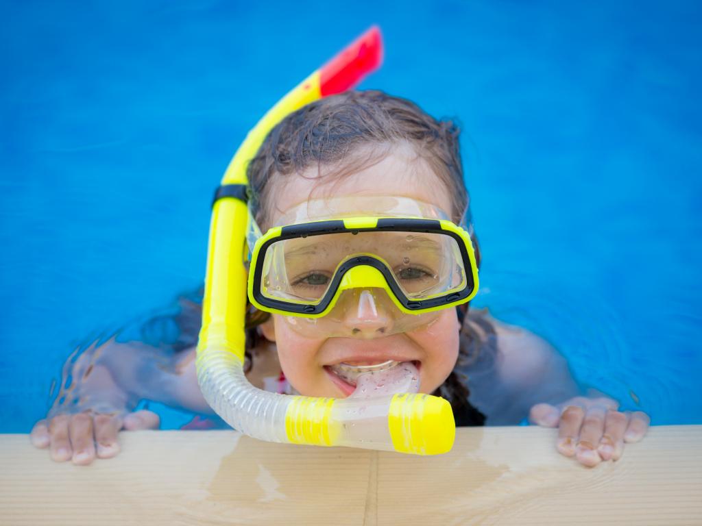 Wallpaper A little girl in a mask with a tube is swimming in the pool