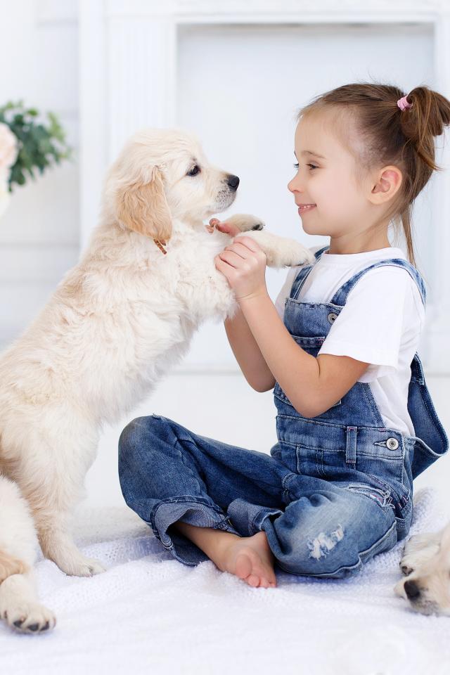 Wallpaper Little girl playing with puppies of golden retriever