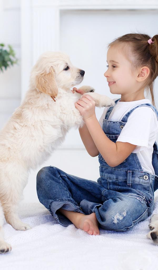 Wallpaper Little girl playing with puppies of golden retriever