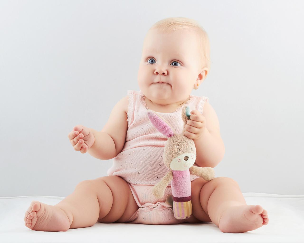Wallpaper Blue-eyed baby with a soft toy on a gray background