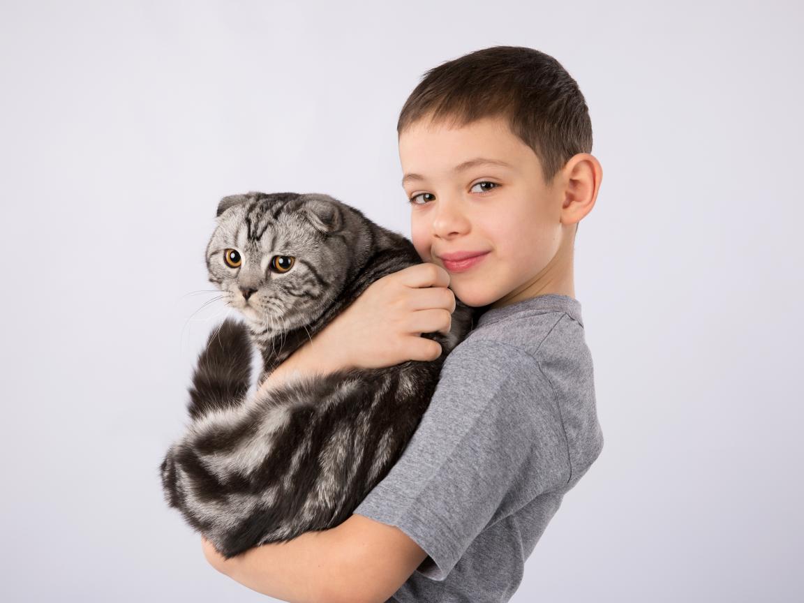 Wallpaper Little boy with a big cat on a gray background