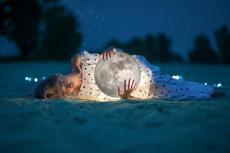 Wallpaper A little boy in a dream holds in his hands a magical blue moon