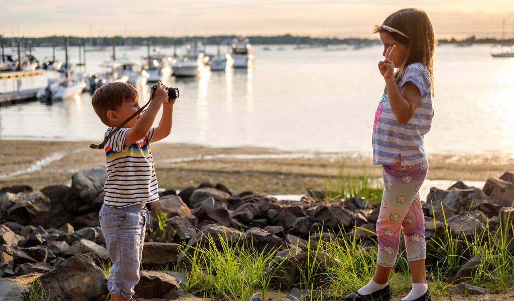 Wallpaper A little boy is taking pictures of a girl on the beach