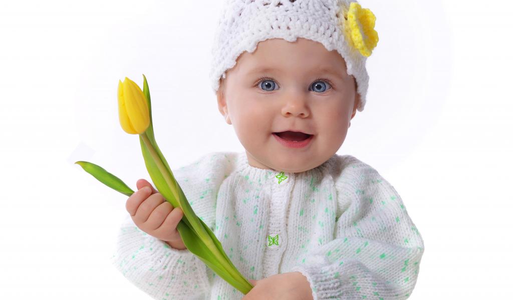 Wallpaper Blue-eyed little girl with yellow tulip in hands