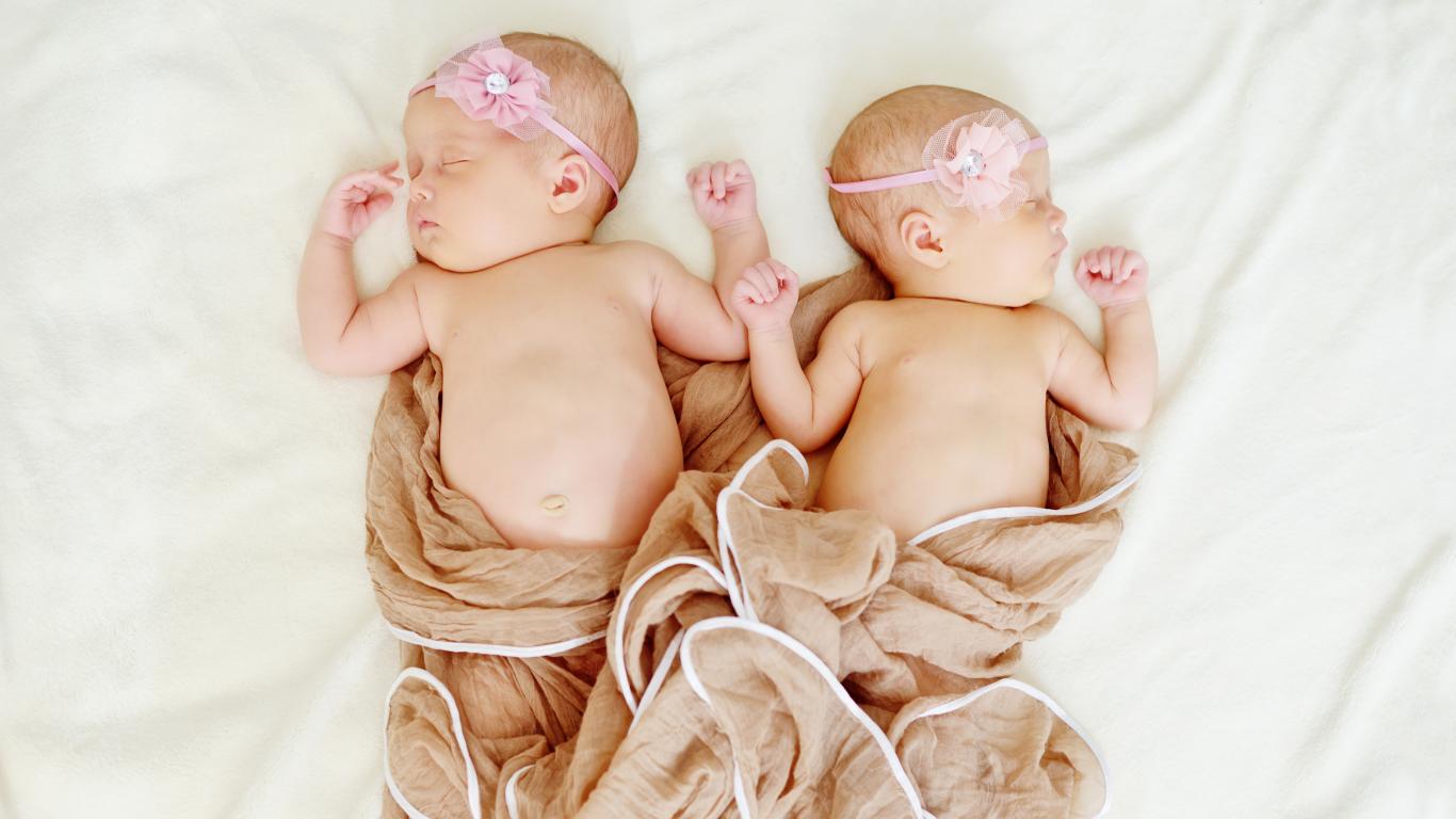Wallpaper Two sleeping babies with pink flowers on their heads