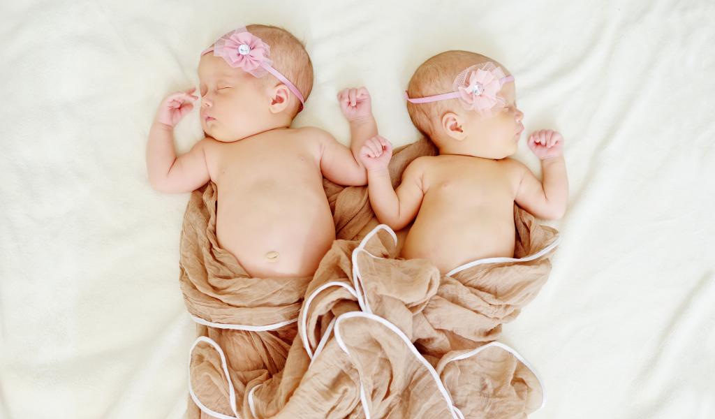 Wallpaper Two sleeping babies with pink flowers on their heads