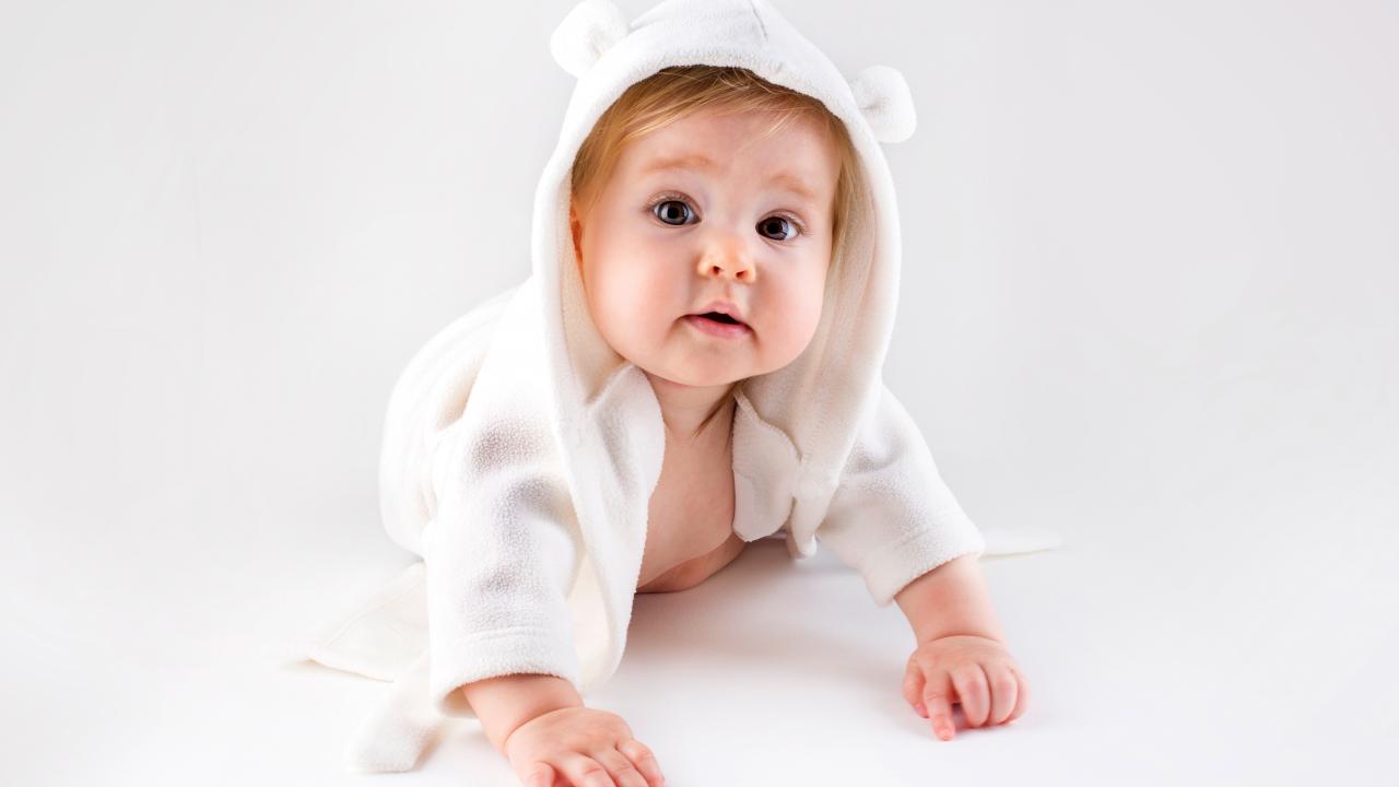 Wallpaper Baby girl in white dressing gown with ears on hood