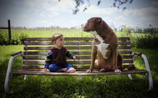 Wallpaper A little boy is sitting with a big dog on a bench