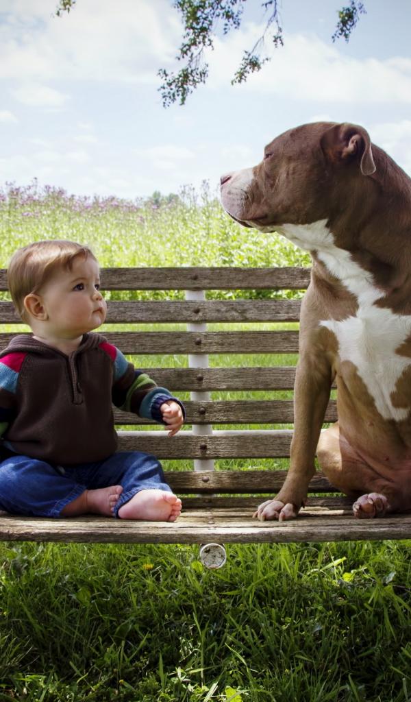 Wallpaper A little boy is sitting with a big dog on a bench
