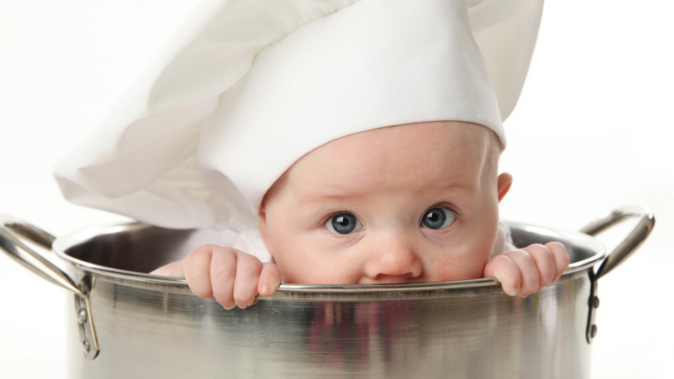 Wallpaper A small child is sitting in a large iron pan
