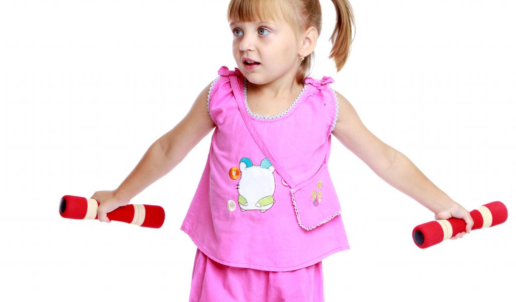 » Wallpaper Little girl in pink suit with dumbbells in hands