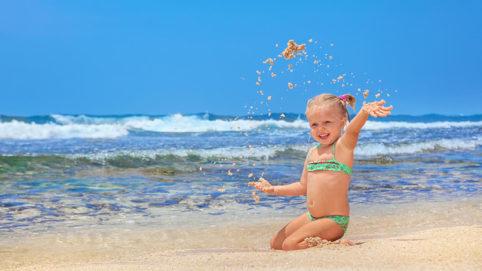 Wallpaper Little smiling girl playing on the beach with sand