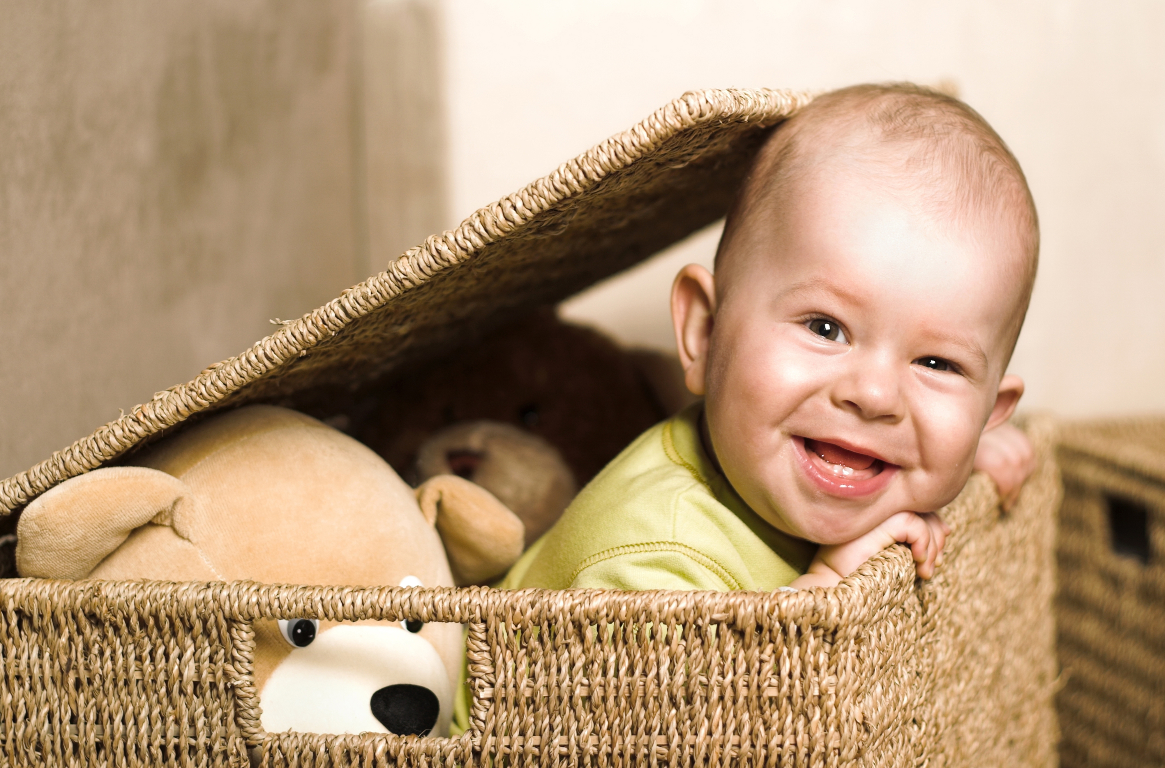 Wallpaper Little smiling child sitting in a basket with toys