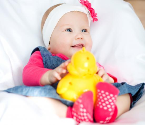 » Wallpaper Smiling blue-eyed baby girl with toy in hands