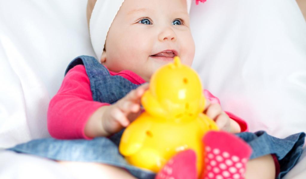 » Wallpaper Smiling blue-eyed baby girl with toy in hands