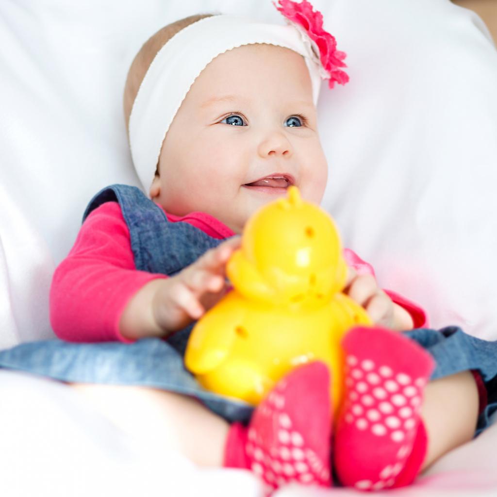 » Wallpaper Smiling blue-eyed baby girl with toy in hands
