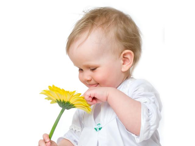 Wallpaper Cute baby with a yellow gerbera flower on a white background
