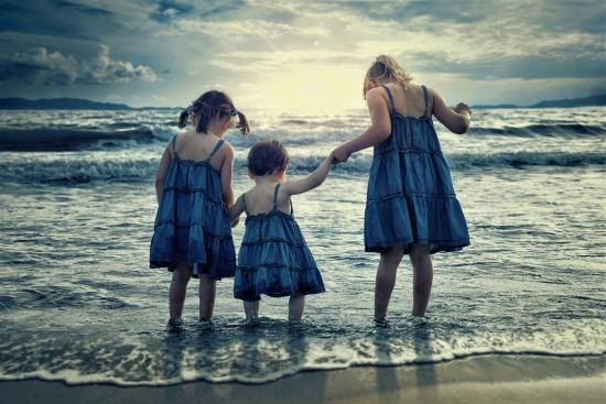 Wallpaper Three little girls stand in the water by the sea