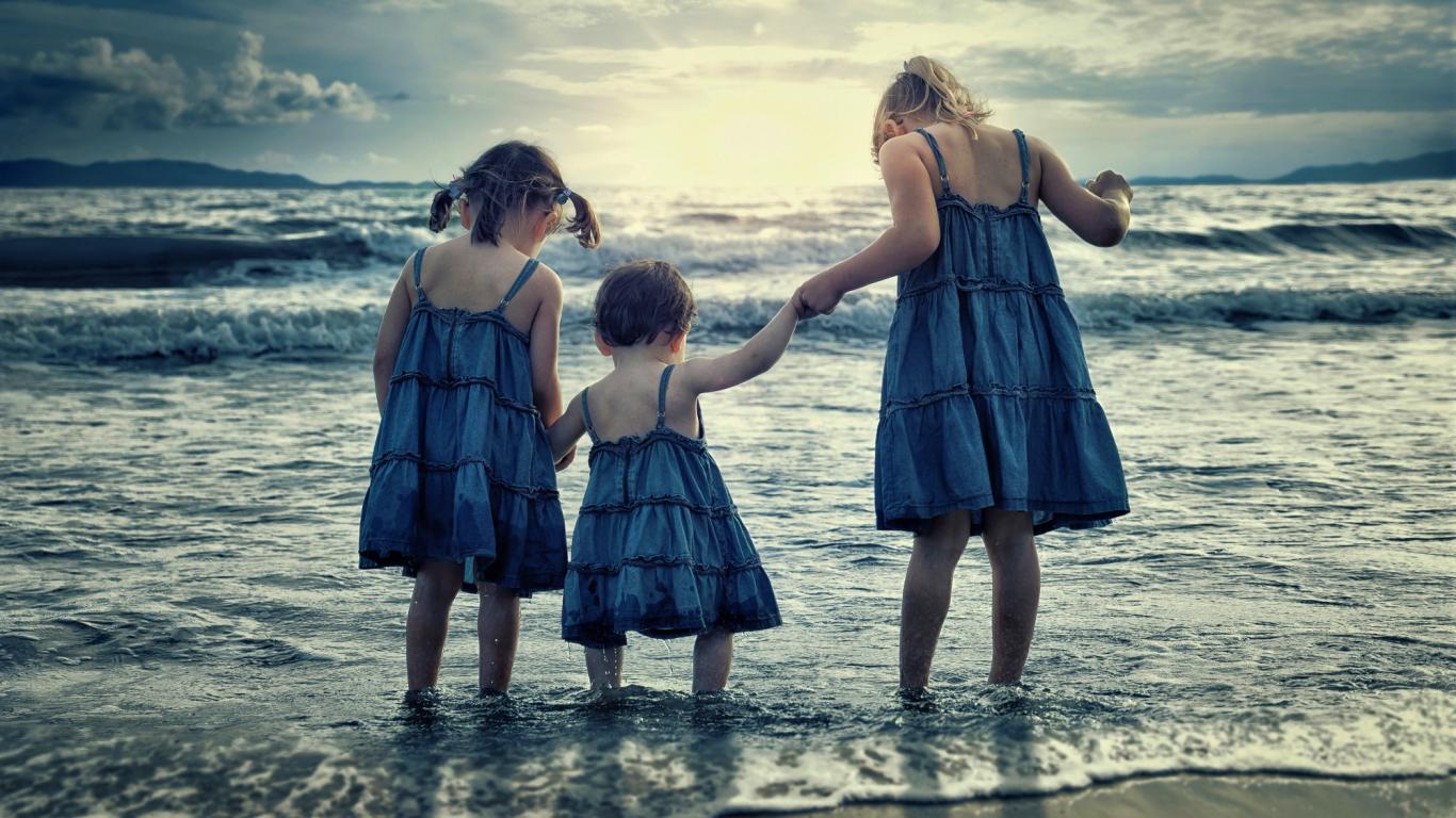 Wallpaper Three little girls stand in the water by the sea