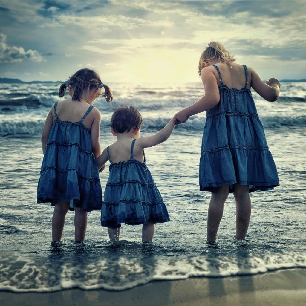 Wallpaper Three little girls stand in the water by the sea