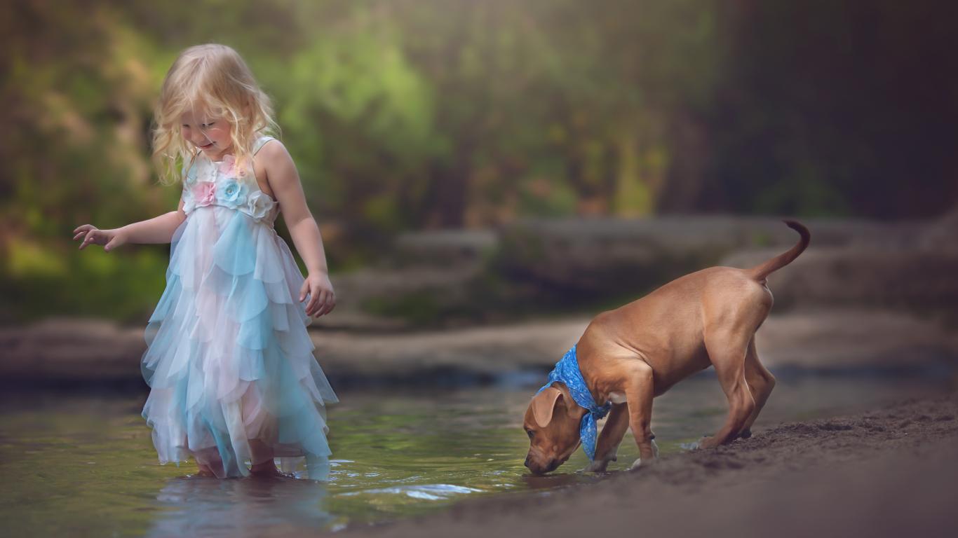 Wallpaper Little girl in a beautiful dress with a puppy by the stream