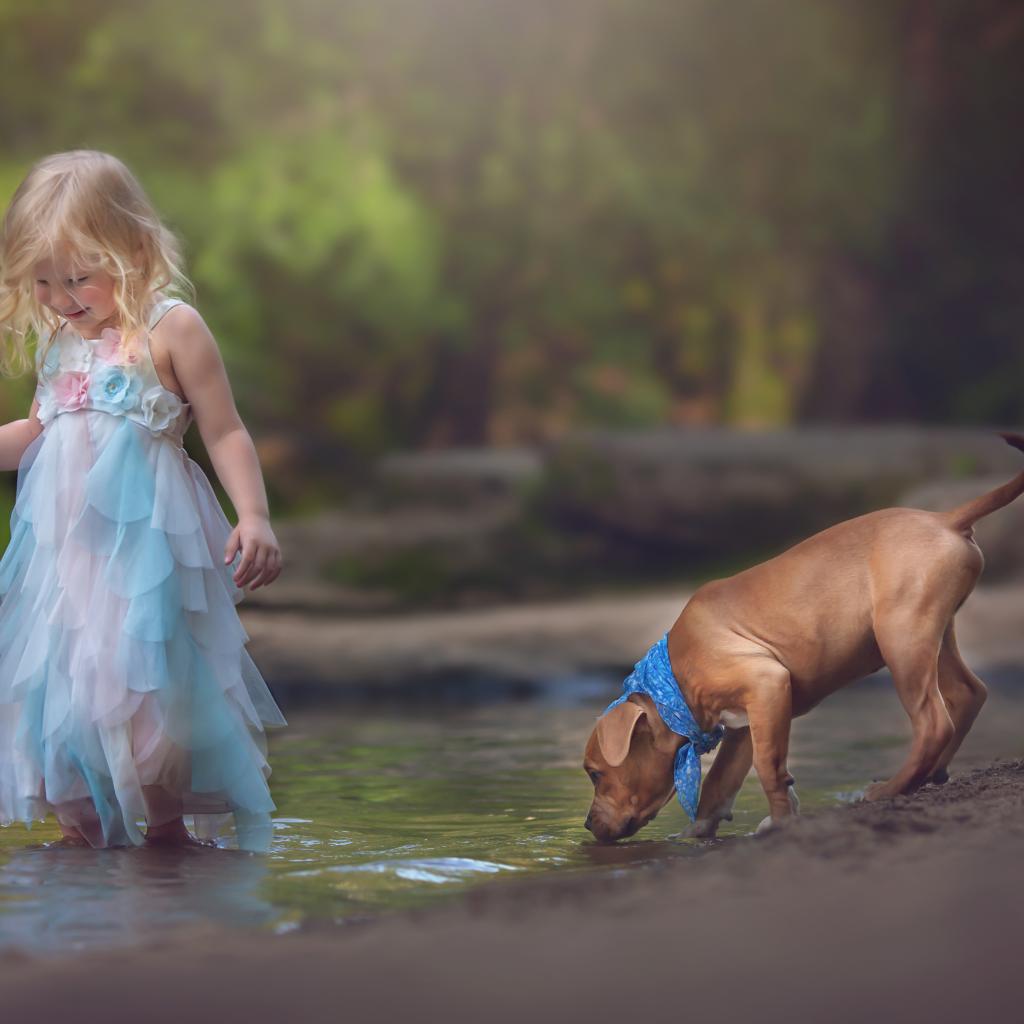 Wallpaper Little girl in a beautiful dress with a puppy by the stream