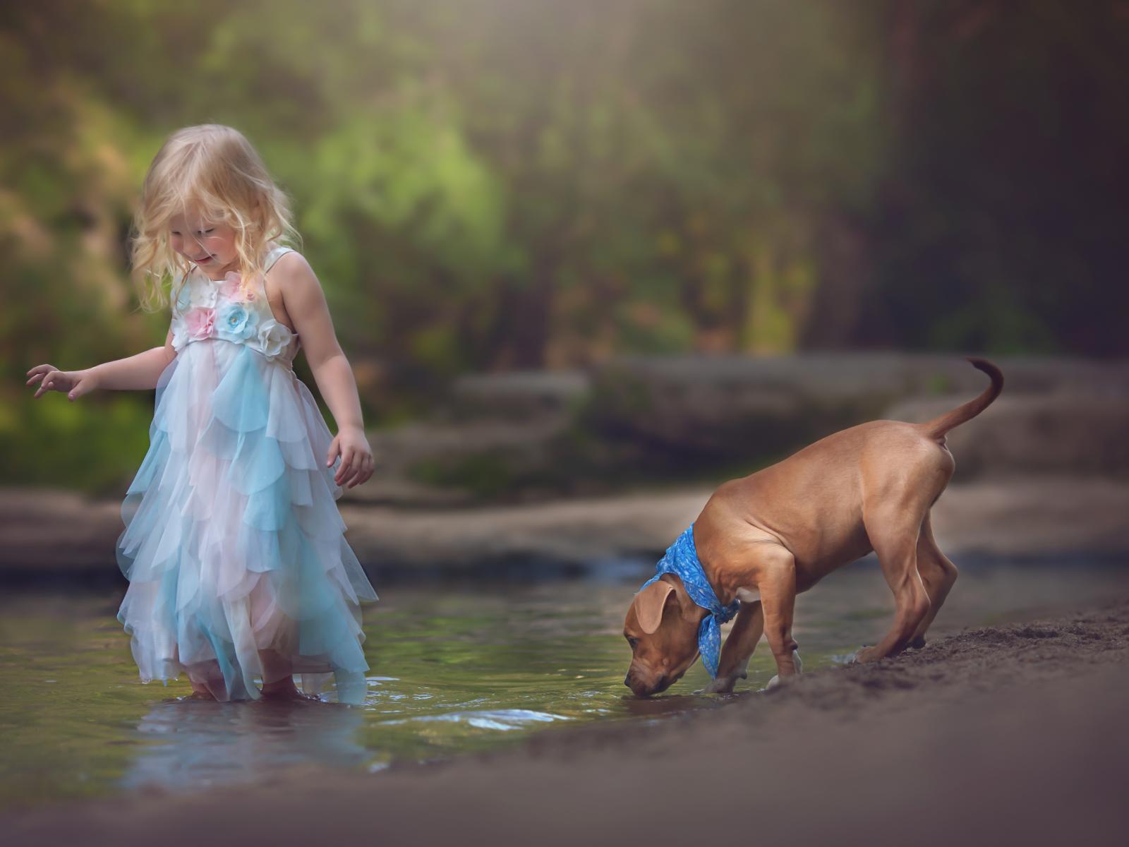 Wallpaper Little girl in a beautiful dress with a puppy by the stream