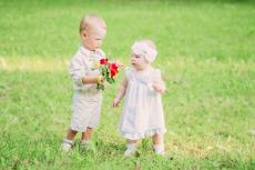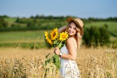 Wallpaper A little girl with a bouquet of wild flowers walks around the wheat field