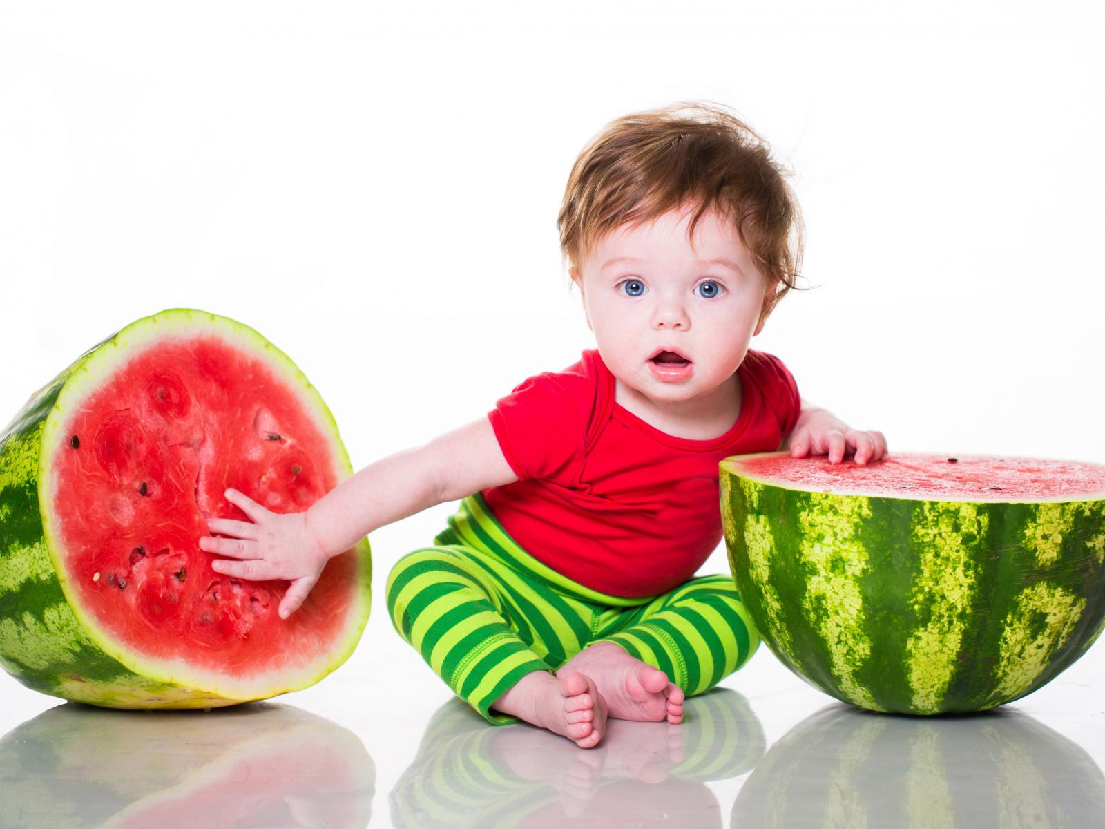Wallpaper Little boy with half a watermelon on a white background