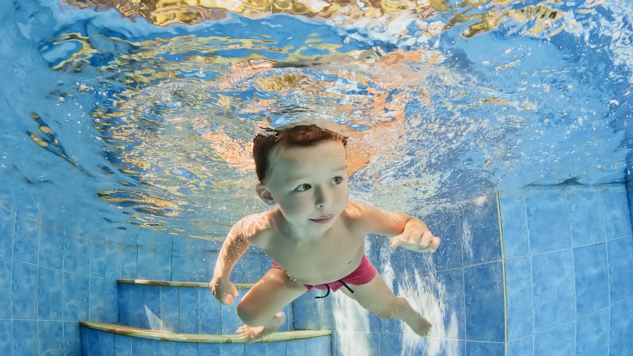 Wallpaper Little boy swims under the water in the pool
