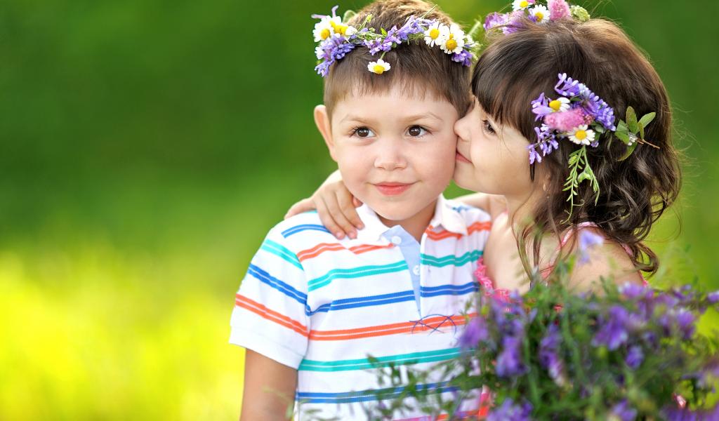 Wallpaper Little boy and girl with wreaths of wild flowers on head