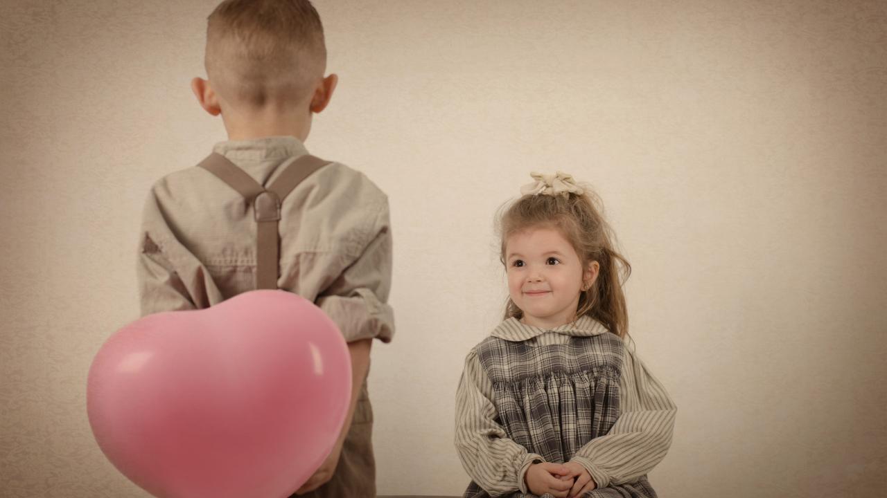 Wallpaper A little boy gives the girl a ball in the shape of a heart