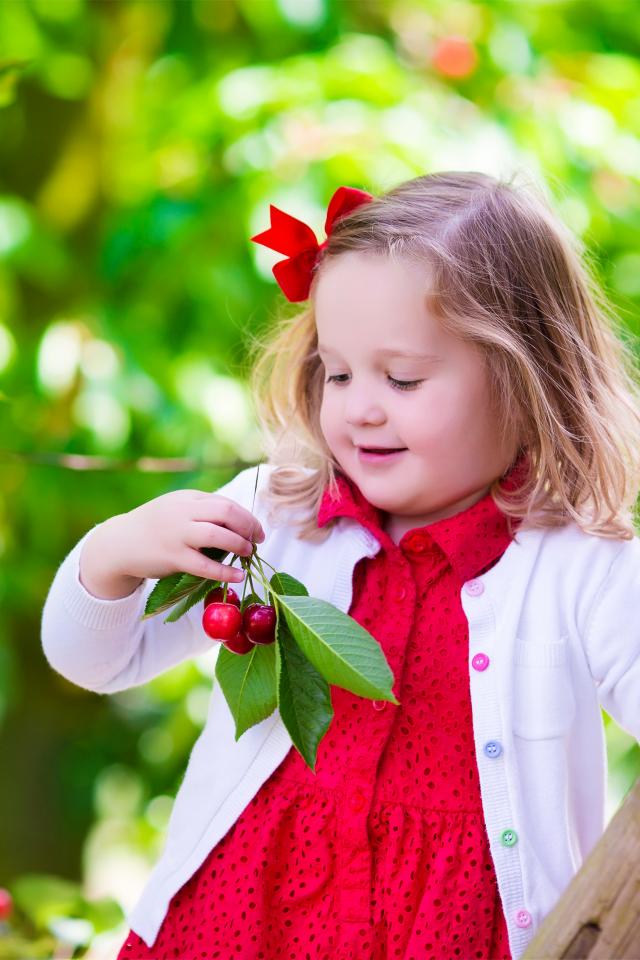 Wallpaper Little smiling girl is tearing cherries from a tree