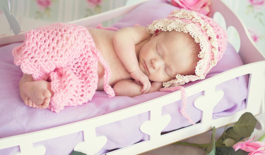 Wallpaper A sleeping baby girl in a pink suit in a cradle
