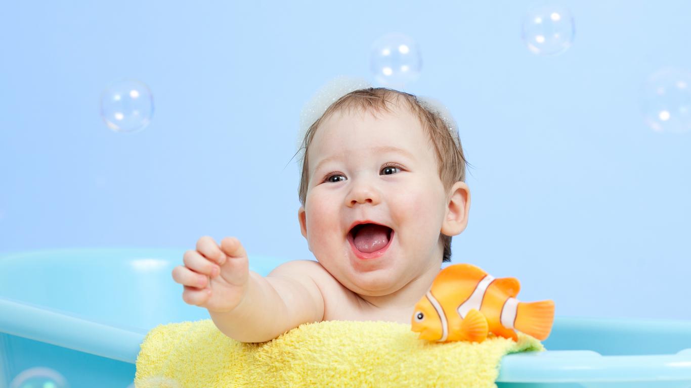 Wallpaper A merry toddler bathes in the bathroom with a toy fish