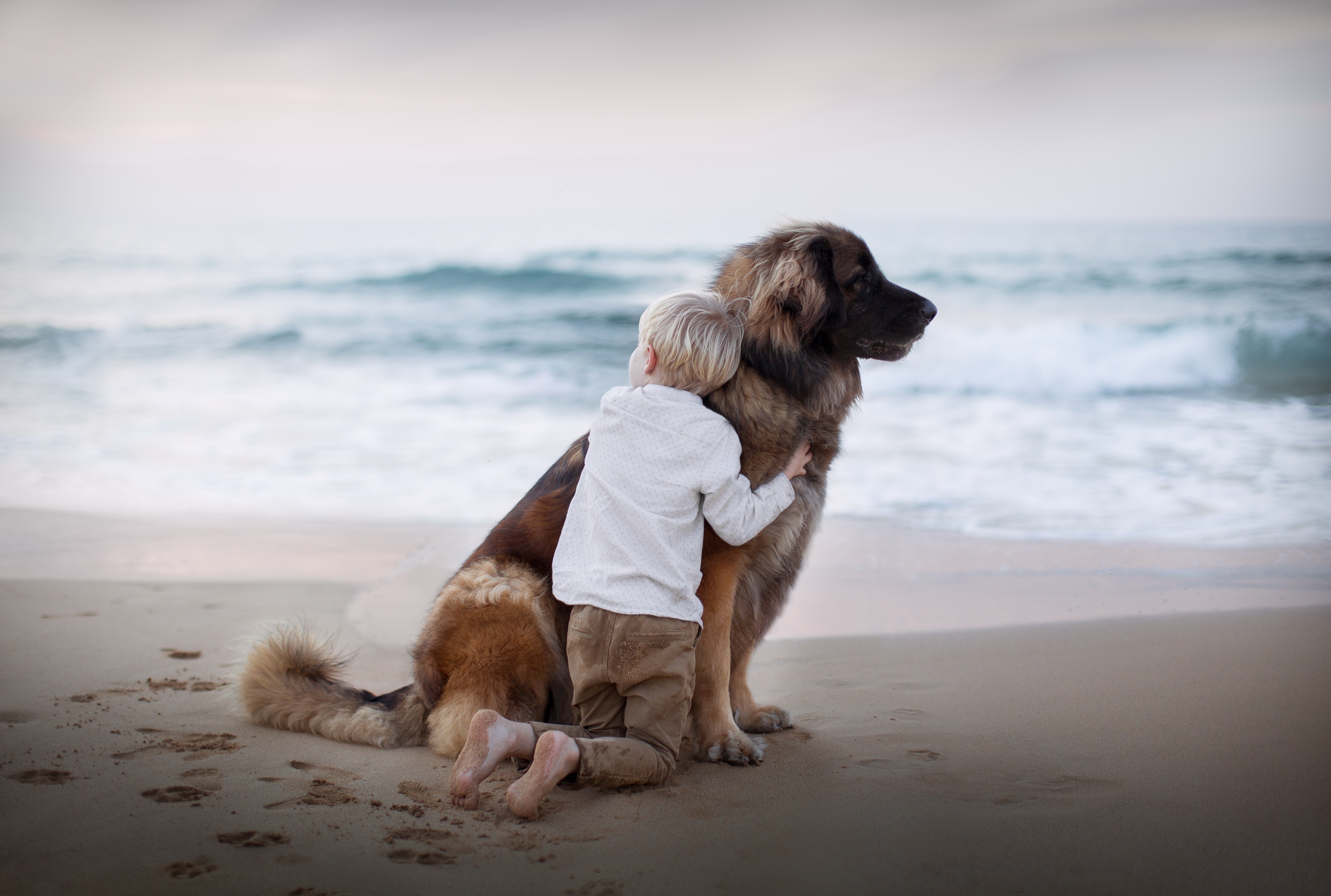 Wallpaper Little boy hugging big dog on the beach