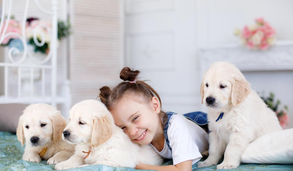 Wallpaper Little smiling girl lies with puppies of a retriever