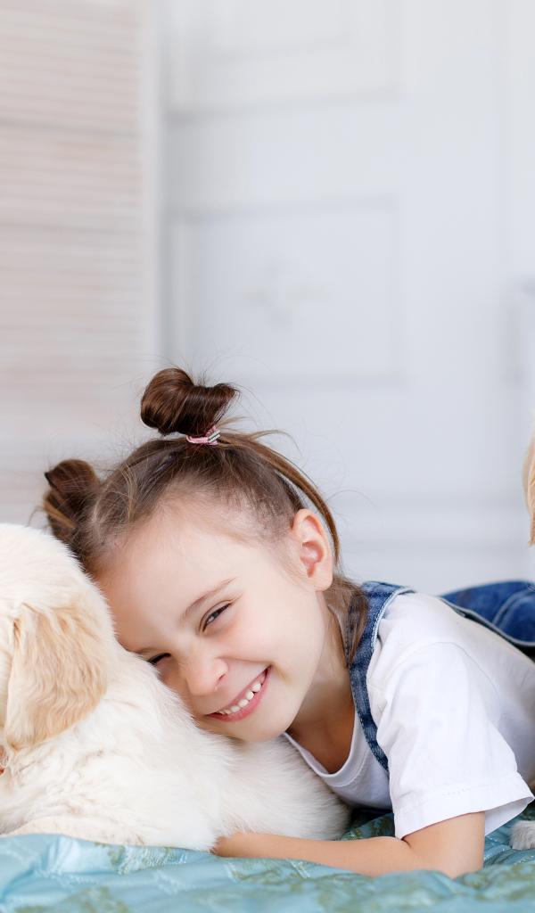 Wallpaper Little smiling girl lies with puppies of a retriever