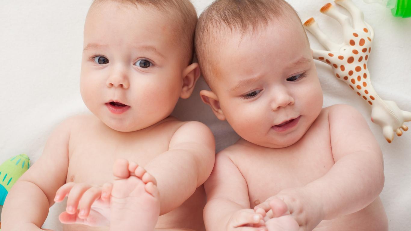 Wallpaper Two small baby twin babies with a toy