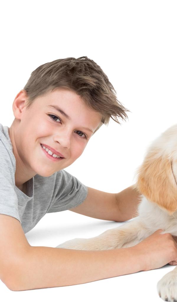 Wallpaper Little boy with a retriever puppy on a white background