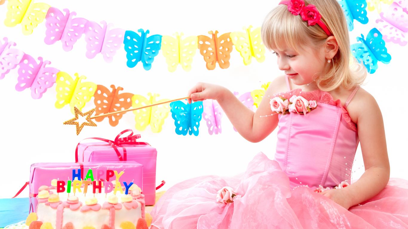 Wallpaper Little girl in pink dress with cake and birthday presents