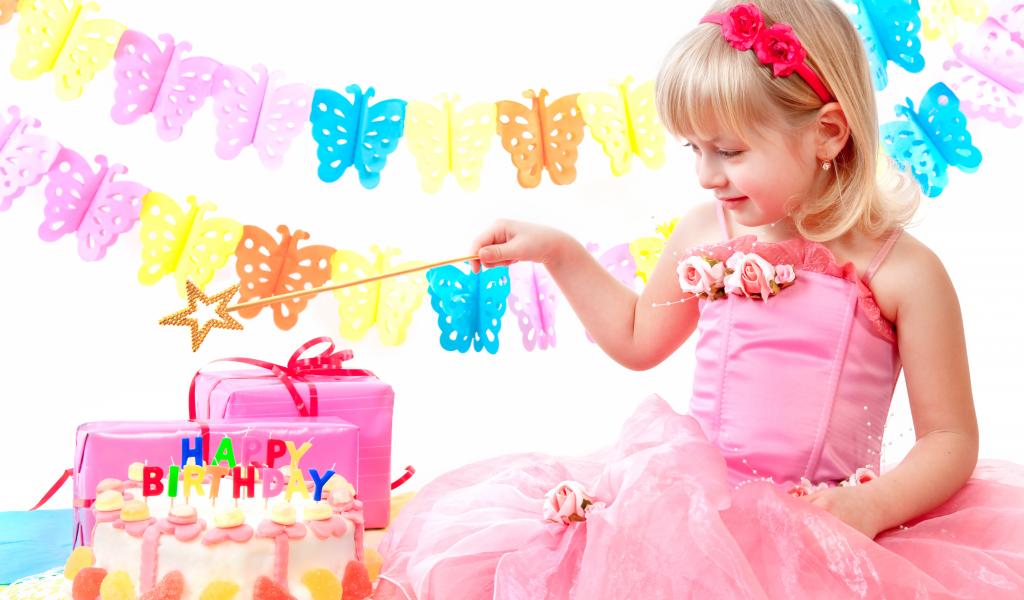 Wallpaper Little girl in pink dress with cake and birthday presents