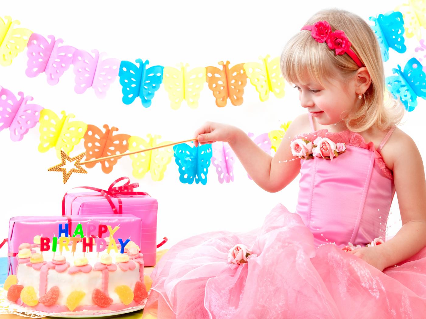 Wallpaper Little girl in pink dress with cake and birthday presents
