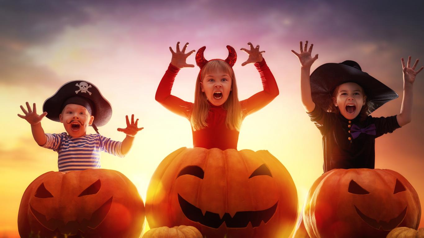 Wallpaper Little children in Halloween costumes with big pumpkins