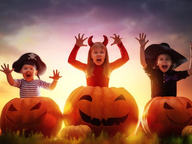 Wallpaper Little children in Halloween costumes with big pumpkins