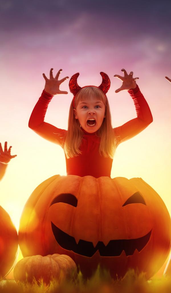 Wallpaper Little children in Halloween costumes with big pumpkins