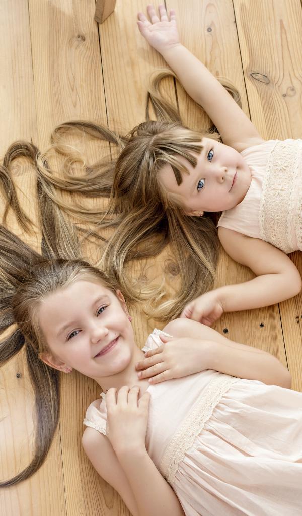 Wallpaper Two little girls with long hair lie on the floor