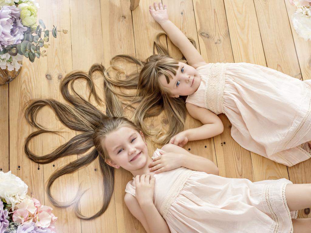Wallpaper Two little girls with long hair lie on the floor
